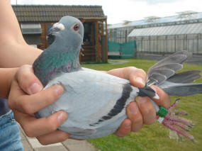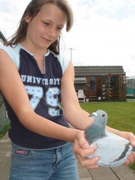 Om 10 uur 43 zagen we de eerste duif aankomen. Deze was in eerste instantie het hok al voorbijgevlogen want we zagen hem terugkomen vanuit de richting van het dorp. Met zulke snelheden en nog weinig ervaring is dat wel te verklaren.